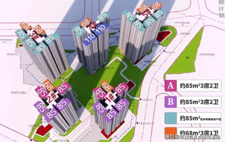 整体规划了5栋30-32层的住宅,围合式布局,产品涵盖68、85和110平的三至四房