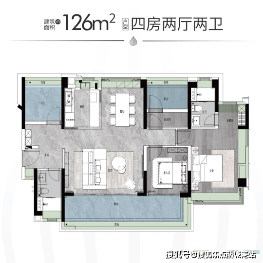 建面约 126 平四房两卫户型,有横厅和竖厅两个版本可选,各具特色,满足不同家庭的居住偏好。横厅版本同样采用 LDKB 一体化、南向四开间设计,南北通透,约 8.32.2 米的超长景观阳台,把小区的园林景观一览无余,也进一步提升了整体的空间尺度感。竖厅版本拥有约 7.22.2 米的宽景阳台,可望江园双景,一边是珠江的壮阔江景,一边是小区的精致园林,双重景观享受拉满。