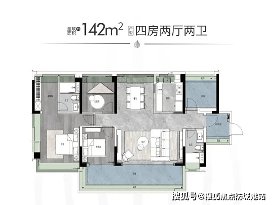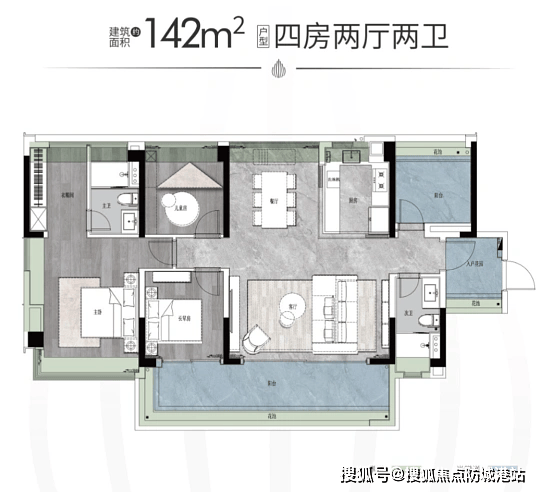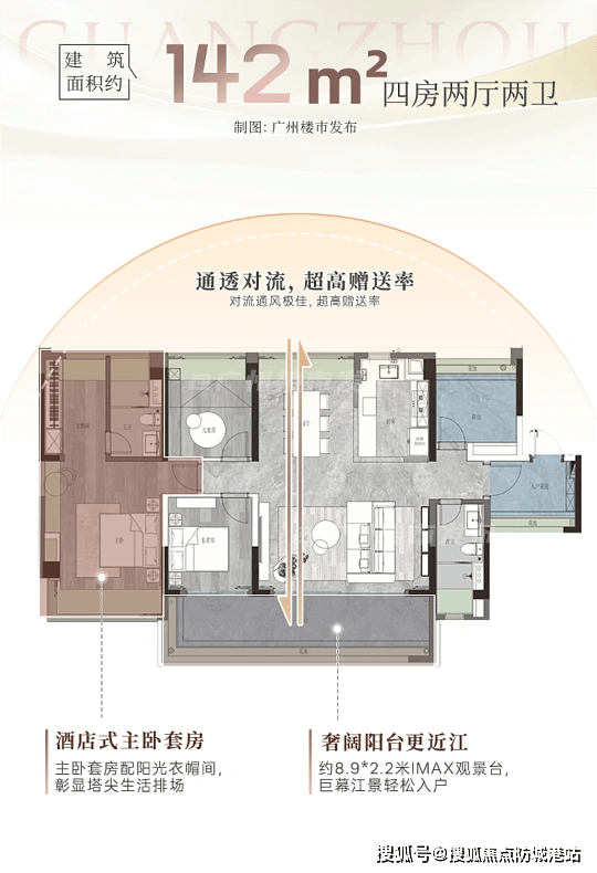 建面约 142 平四房两卫户型,户型方正,四开间朝南,是舒适度拉满的改善户型。我们实地实测,这个户型的公区采用 LDKB 一体化设计,整体空间达到了约 40 平,客厅净宽达到了 5.7 米,观景阳台长近 9 米,进深约 2.2 米,站在阳台上,就能直接看到无遮挡的珠江江景,IMAX 级的观景体验直接拉满。这个户型非常适合三代同堂的改善家庭,四个房间分布合理,互不打扰,既能满足一家人的居住需求,又能保证每个家庭成员的隐私空间。对比同区域同面积段的竞品户型,我们的户型多了一个朝南的房间,阳台长度多出了近 2 米,空间使用率高出了 12%,优势非常明显。