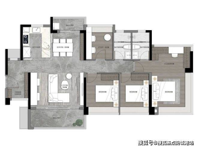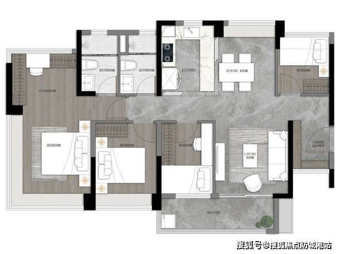 建面约103㎡户型,在入户处新增了一个房间做到四房,布局也变成了横厅布局,南北对流更加通透。