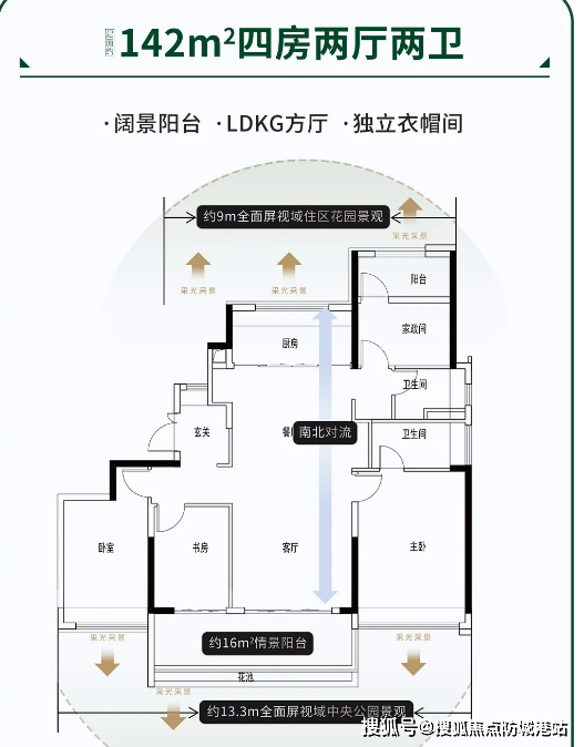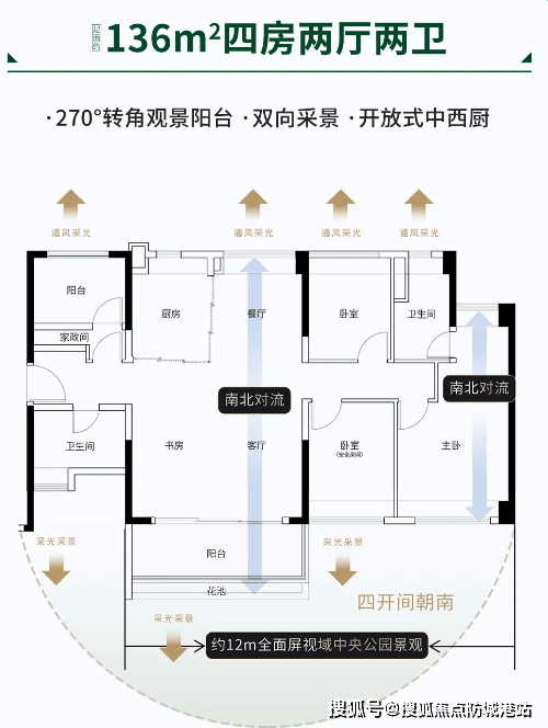 户型布局:户型整体南北通透,大面宽、短进深设计,采光通风效果极佳,客厅采用超大面宽设计,搭配全景落地窗,视野开阔,能将社区内的园林景观与周边的公园美景尽收眼底;餐厅与客厅相连,形成超大一体化活动空间,同时餐厅配备独立飘窗,既能提升采光效果,又能作为休闲区域,增加空间层次感;四个卧室均为南向设计,带有全景飘窗,空间宽敞舒适,采光充足;主卧为豪华套间设计,配备独立卫生间、衣帽间与观景飘窗,空间奢阔,能满足业主的高端居住需求,保障业主的居住私密性与舒适度;两个次卧为套间设计,配备独立卫生间,方便家人使用,提升居住便捷度;还有一个次卧可作为书房、儿童房或客房使用,灵活多变;公共卫生间干湿分离设计,使用便捷,卫生整洁。