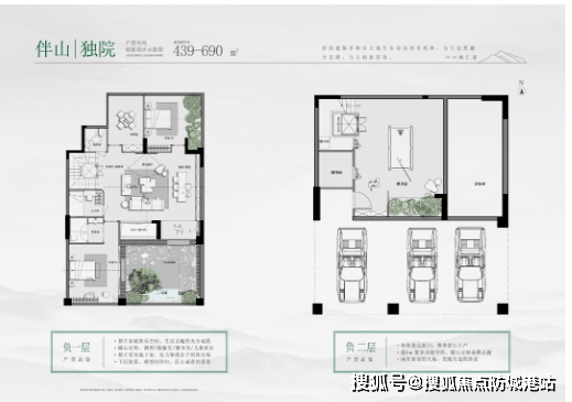 3. 下叠户型:面积约470-600㎡,布局为1、M、-1、-2三层,总价区间800-1700万,是项目中面积最大、功能最齐全的户型。户型特色为地下两层可自由改造,一层为生活区域,配备客厅、餐厅、厨房、卫生间及一间卧室,客厅挑高设计,显得大气宽敞,连接庭院,可直达社区山体公园,休闲便捷;M层为休息区域,配备3-4间卧室,均为套房设计,私密性强,部分卧室带有飘窗,提升居住体验;地下一层和地下二层可改造为私人影院、健身房、酒窖、储藏室等,满足业主的个性化需求,同时地下层通风效果优良,不会出现潮湿问题;此外,下叠户型还配备私人庭院,可打造花园、休闲区,适合大型家庭自住、企业办公兼自住,彰显高端品质。
