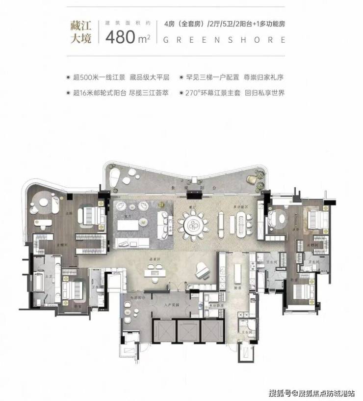 『悦岛』组团约365㎡环幕江景大平层,五房双套房设计,拥有6.8米奢阔客厅及前后空中花园式阳台,南北通透,空间布局科学合理,为大家庭提供尊崇体验。湾流480㎡天幕揽江大平层,则为超高端珍藏住宅,四房双套房加多功能房配置,三梯一户极致私密,配套世界顶奢品牌与梁志天大师设计,为高端客群提供完美居住体验。户型设计兼顾通风、采光和功能分区,注重居住舒适性和视觉享受。