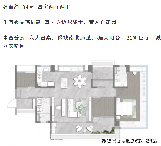 最后是建面约134㎡四房两厅两卫户型:该户型堪称千万级豪宅同款,真·六边形战士,适合高端改善型家庭。户型带入户花园,提升入户仪式感和收纳空间;中西分厨+六人圆桌设计,适合家庭聚会、亲友聚餐,提升居住质感;稀缺南北通透设计,采光通风俱佳;8m大阳台、31㎡巨厅,空间宽敞,视野开阔,能满足高端改善型家庭的休闲娱乐需求;独立衣帽间设计,提升居住私密性和舒适度,让主人拥有专属的收纳空间。