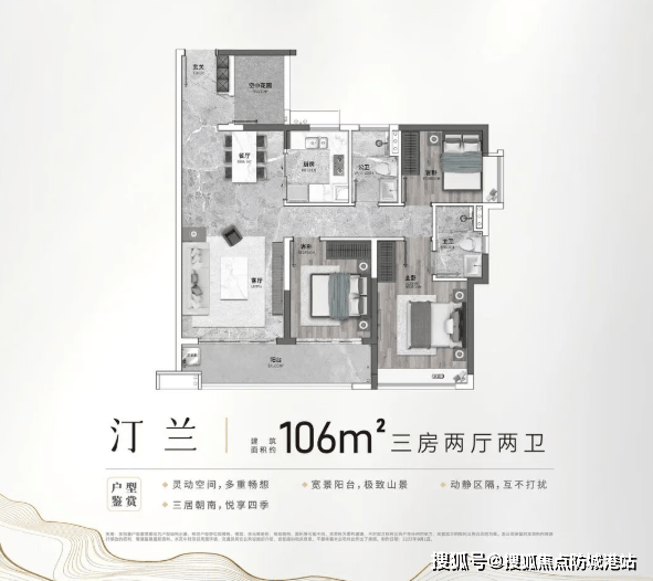 106㎡舒适三房:阔景阳台连通客厅与次卧,形成超大开间,山景尽收眼底;厨房可改造为隐藏式推拉门,兼顾开放与功能。