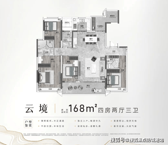 168㎡纯改善大平层:专梯入户,约7米超宽阳台直面一线山景;中西厨分离,家政动线独立,归家、社交、休憩互不干扰,尽显尊崇尺度。