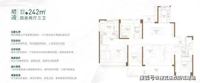 242㎡的 4 房 2 厅 3 卫户型,专梯专户的设计,进一步强化了居住的私密性与专属感,业主拥有独立的出入空间,无需与他人共享电梯,享受更加便捷、私密的归家体验。