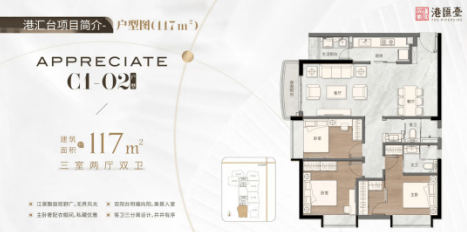 117平方米三房两厅两卫:阳台飘台视野广,无界风光,主卧奢配衣帽间,私藏优雅双阳台向阳。