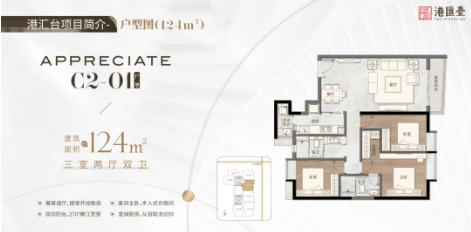 124平方米三房两厅两卫:餐客通厅,拥享开阔格局,套间主卧,步入式衣帽间,270度瞰江赏景。