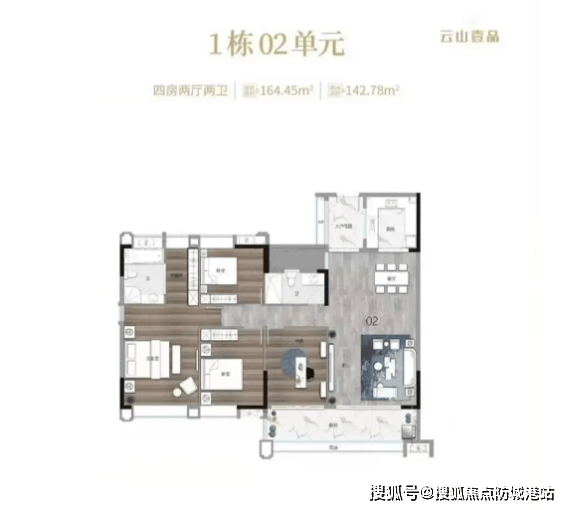 3. 164㎡四房二卫户型:该户型定位高端改善,尽显豪宅质感。户型南北通透,全明设计,每个房间都能享受充足的采光和良好的视野;客厅挑高设计,搭配全景落地窗,可直接眺望白云山景观,山、水、园景尽收眼底;主卧套房设计,配备独立卫浴、衣帽间和观景飘窗,提升了居住的舒适度和尊贵感;独立书房设计,为业主提供安静的办公和阅读空间。