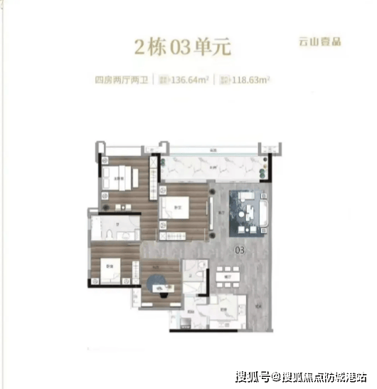 2. 136㎡四房二卫户型:该户型为改善型主力户型,空间尺度舒适。四房设计可轻松满足多孩家庭或三代同堂的居住需求;客餐厅一体化设计,延伸了空间视觉感,同时连接大面宽阳台,通风对流效果极佳;U型厨房设计,操作空间充足,动线合理,方便家人烹饪;卫生间干湿分离,保持室内环境干爽整洁。