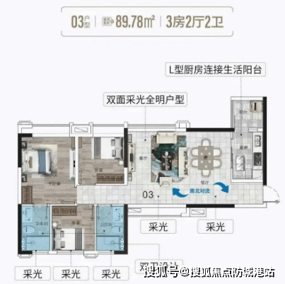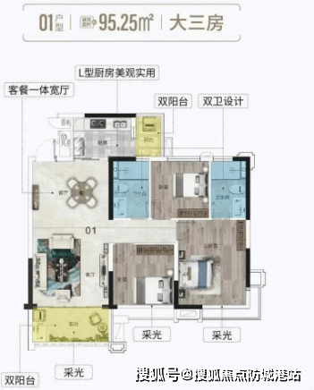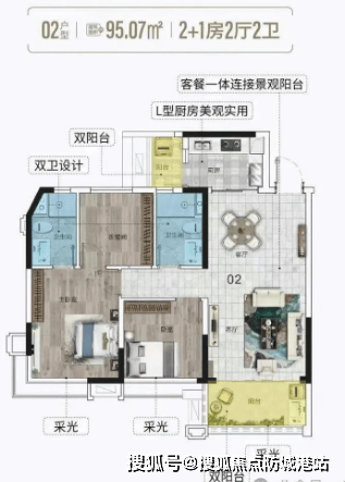 95平米3房2厅:单边位置设计,多开间朝南,约10米南向采光面阔景阳台无遮挡,俯瞰中央园林,远眺城市景观。