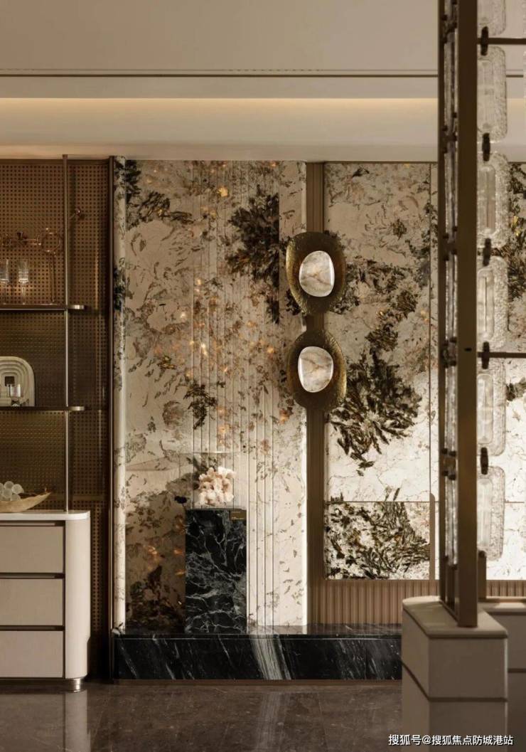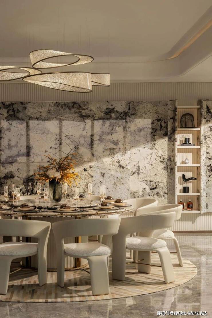 琶洲公馆的瑰丽云境样板房,以 “阅遍世界・归来是家” 为设计理念,将珠江的自然意象与国际审美融合,打造出 CBD 里的隐奢居所。入户玄关就充满仪式感,双开纯金属入户门搭配隐藏式门锁,独特的肌理设计尽显大气,雪山蓝石材的运用则为空间注入了清新生机,让归家的第一步就充满温馨。餐客厅与藏酒室采用一体化布局,暖金色调搭配巴黎冰玉地面奠定奢雅基调,六米宽的餐厅搭配透光雪山蓝石材,与客厅连通形成开阔豪厅,270° 全景落地窗更是将珠江夜景与城市天际线尽收眼底,夜幕降临时,伴着江风与星光用餐,是独属于塔尖人群的浪漫。藏酒室以威尼斯棕岩板为展示柜背景,冷峻质感与暖调橙色皮革形成鲜明对比,推拉门上的 “破浪白帆” 艺术画面,还巧妙呼应了珠江的文化脉络,是收藏爱好者的专属天地。开放式厨房配备精致岛台,不仅优化了空间动线,意大利鱼肚金大理石台面还为烹饪空间增添了艺术气息,让下厨也成为一种享受。套房设计更是将私密与舒适拉满,主卧以 “艺术帆船” 为设计意象,波浪造型背墙与椭圆吊顶营造出轻盈奢雅的氛围,主卫用雪花白大理石打造极简质感,绿色奢石又添了几分清新;次卧套延续低饱和度色调,双肌理皮革的搭配,让睡眠空间柔软又协调。