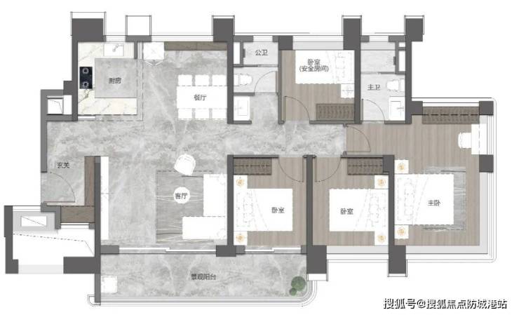 在约100平方米的户型中,设计师通过四房布局实现空间利用最大化。客厅与餐厅采用一体化设计,使家庭公共活动空间更加宽敞。多开间朝南的布局,使居住空间拥有较好的采光条件,同时能够最大程度利用珠江景观资源。