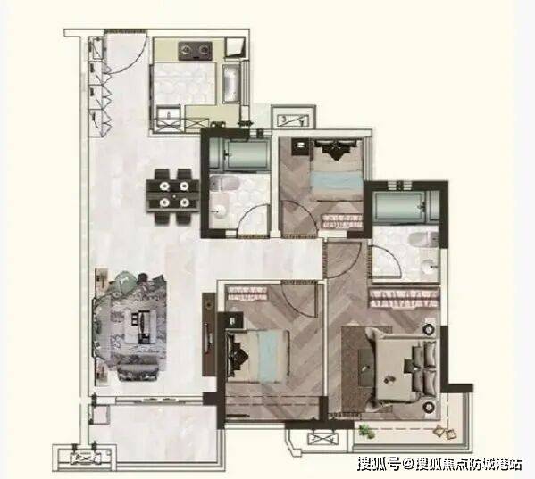 84㎡ 3 室 2 厅 2 卫:在77㎡基础上优化空间,客厅和卧室更为宽敞,提升居住舒适度。