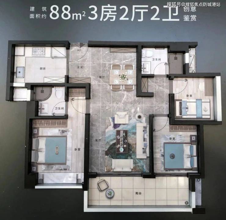 建面约88㎡3房2厅2卫设计,设计则更为舒适。阳台横跨了卧室和客厅,采光通风更好。同时,主卧还做了套房设计,利用一角还做了一个柜子增大储物空间。
