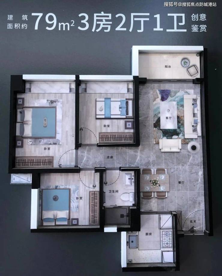 建面约79㎡3房2厅1卫设计,户型非常刚需,进门即入户玄关,厨房U型设计,客餐厅相连,整个户型十分地实用,很适合预算有限的刚需家庭。