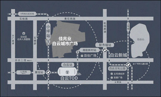 佳兆业白云城市广场位于白云区石槎路以东,京广线以西,与“换乘之王”地铁8号线,小坪站不到300米。
