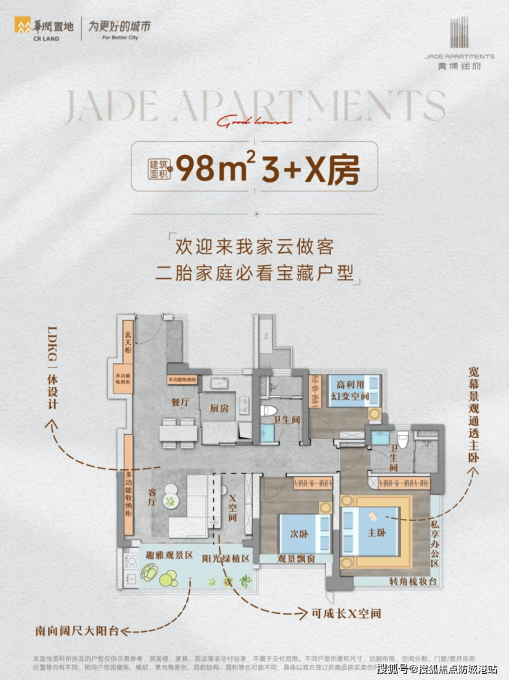 创新户型设计:例如98平方米和113平方米户型,客厅旁设有X空间,可根据家庭需求灵活调整,既增加了公区休闲娱乐的空间,又解决了未来可能的家庭成员增长问题。