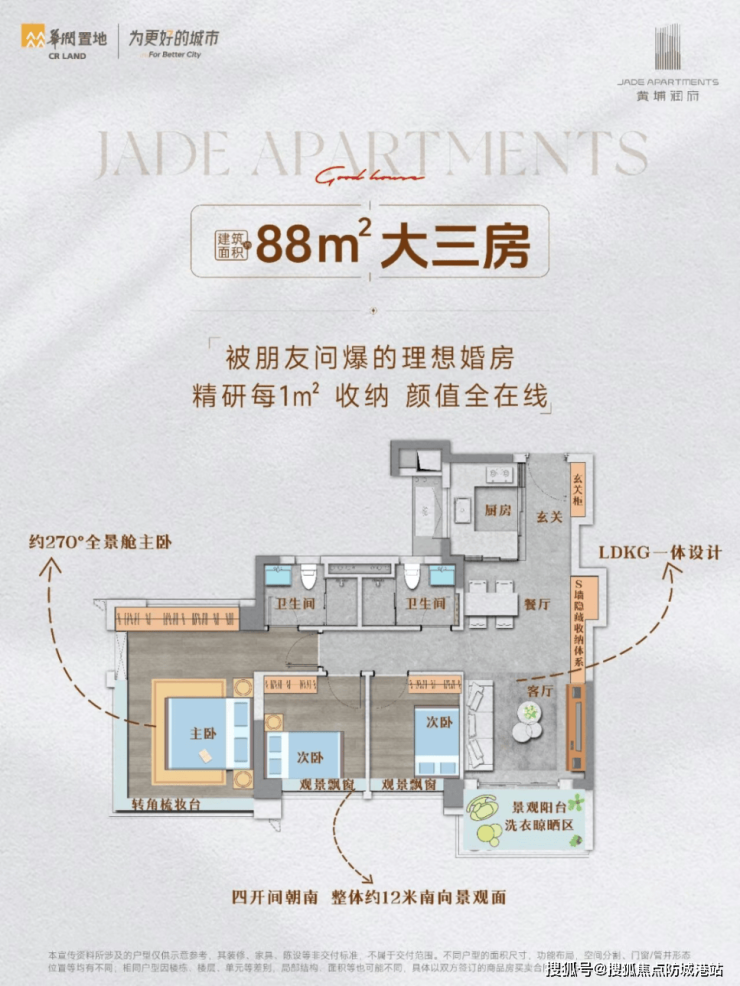 黄埔润府主打88-113平方米户型,其中不乏南向户型,这在同价位项目中较为少见。高层单位更可享有双江视野,景观资源稀缺。此外,项目通过270°无柱巨幕视野、LDKB+S墙设计等创新理念,进一步提升了居住舒适度和空间利用率。