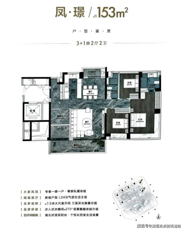 建面约153㎡ 3+1房两厅两卫,是项目的入门级改善户型,专为首次改善三口之家打造,兼顾实用性与舒适性,空间布局合理,每一寸空间都得到充分利用,实得空间堪比市面175㎡户型,性价比突出。该户型采用南北对流双阳台设计,南向宽景阳台长达7.5米,视野开阔,可俯瞰社区园林景观,同时保证室内充足的采光与通风,让室内空气时刻保持清新;北向生活阳台紧邻厨房,方便日常洗衣、晾晒、储物,实现生活功能与休闲功能的分离,提升居住舒适度。