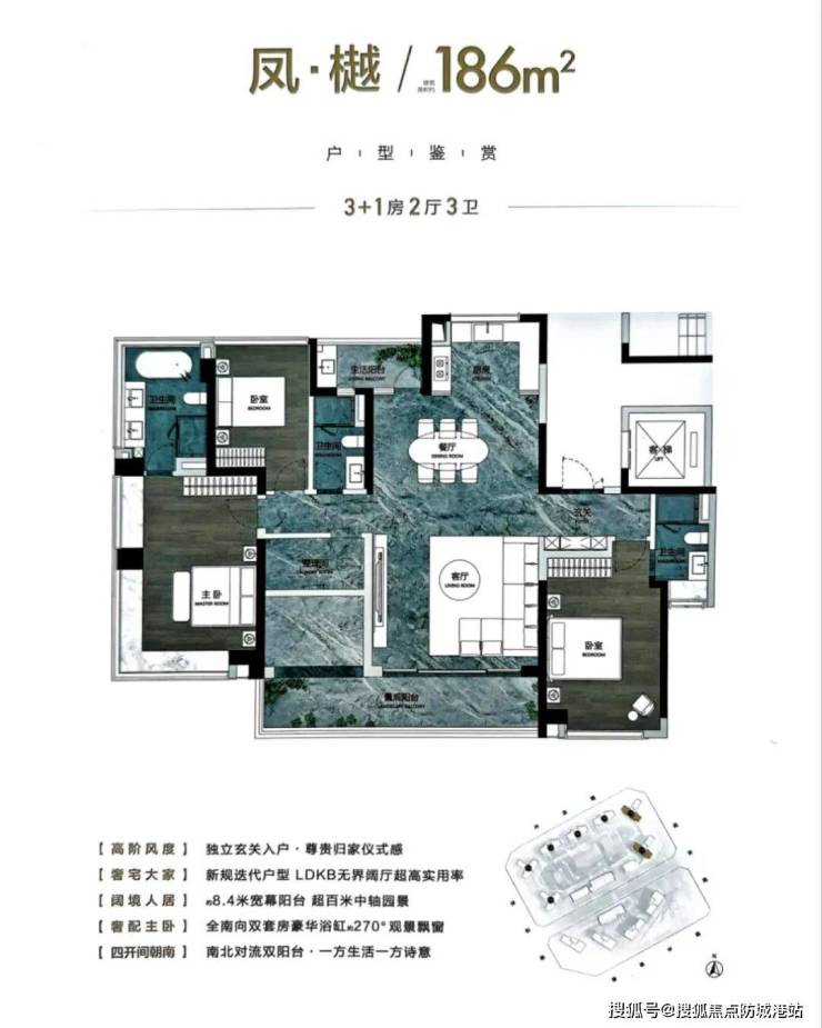 建面约186㎡ 3+1房两厅三卫,是项目的核心主力户型,专为二胎家庭、三代同堂家庭打造,空间宽敞、布局合理,兼顾舒适性与实用性,满足大家庭的居住需求。该户型采用双南向主卧套房设计,两个主卧均朝南,采光充足,空间宽敞舒适,配备独立卫生间,私密性强,可满足家中老人、主人的居住需求,避免了三代同堂居住的尴尬,提升居住舒适度。