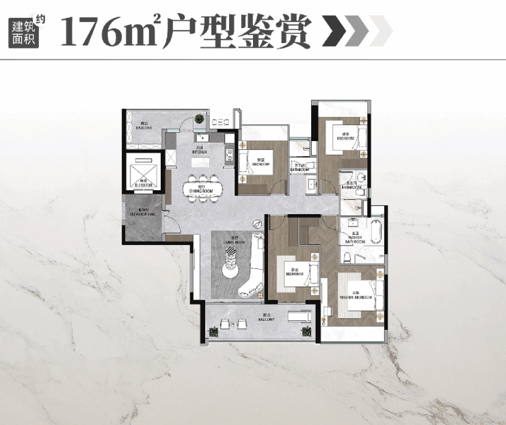 176㎡ 4房2厅3卫:开放式中西厨,约6.7m宽瞰景阳台,双套房行政级配置。