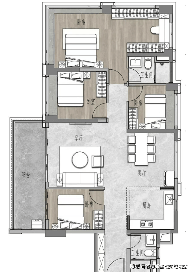 85㎡三房两卫:全卧室朝南,提供竖厅与南北通透两种布局,主卧带独立卫浴,兼顾实用性与舒适度,适合首次改善家庭;