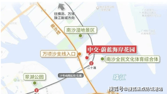 中交・蔚蓝海岸交通优势明显。距离已通车的深中通道南沙线收费站仅约 1 公里,自驾半小时可达深圳前海。距在建的 18 号线南延线(南中城际)二十涌站约 500 米,该线路设计时速 160 公里 / 小时,西线 2027 年通中山市区,东线 2030 年直抵珠海拱北口岸。此外,深南中城际也将在二十涌站南侧设站,未来这里将成为大湾区重要交通枢纽,实现半小时内畅达广州、深圳、中山、珠海。