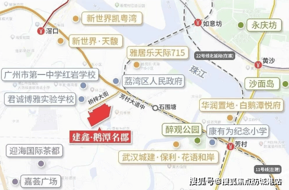 项目地处白鹅潭板块,临近荔湾区政府,处于白鹅潭和滘口板块中间,可承接白鹅潭发展红利。部分户型还可享受江景视野,周边规划为城市重点发展区域,未来配套升级潜力较大。此外,项目周边有大量高端商业体正在建设中,如白鹅潭万象城、聚龙湾太古里等,将进一步提升区域的商业能级。