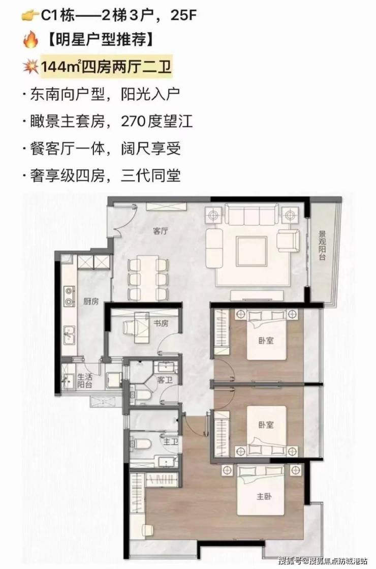 港汇台住宅户型设计科学合理,建筑面积约69至144平方米,提供二至四房产品,满足不同家庭结构需求。户型采用LDK一体化设计,动静分区清晰,双入户大堂提升居住礼遇感。东南向房型享受开阔江景,户户配备双阳台,实现光线与空气最大化利用。主卧朝南,布局舒适自然,兼顾空间美学与生活功能。精心设计的户型使每一户都能兼具舒适、实用和景观优势,呈现高品质城市人居典范。