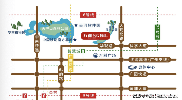 地处天河智慧城“黄金十字轴”交汇点,南望7.5万㎡万科广场,北接广佛环线智慧城站(规划中),未来可1站达金融城、2站抵琶洲、4站通白云机场、5站至广州南站,构建“轨道上的CBD”。在“十四五”规划明确将天河智慧城打造为“数字经济高地+品质宜居新城”的背景下,天河云商汇不仅是空间载体,更是时代红利的兑现入口。