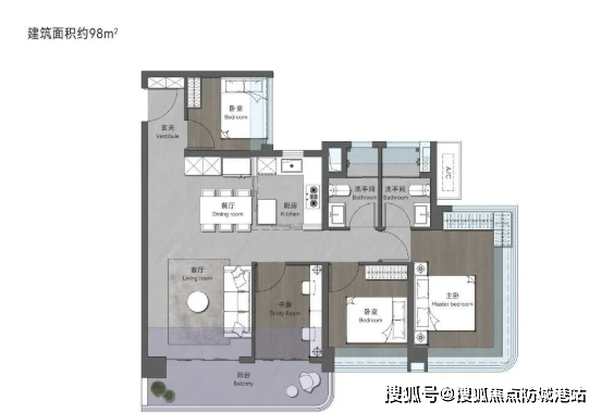98㎡创意四房:LDKB一体化设计,小户型也能实现四房两卫,适合年轻家庭一步到位;