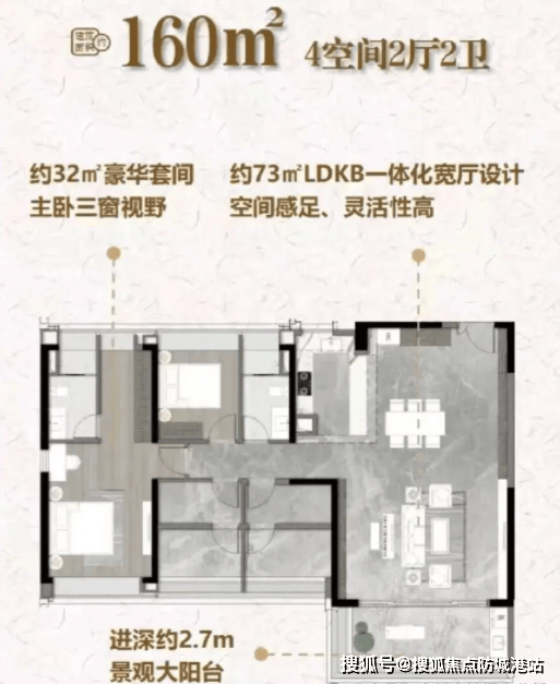 主卧采用套房设计,配备独立卫浴和飘窗,保证了主人的私密性和舒适度。次卧空间也很宽敞,可以作为儿童房或老人房使用。客厅与餐厅相连,形成通透的大横厅,视觉效果开阔大气。无论是三代同堂的家庭,还是二胎家庭,这个户型都能满足大家的居住需求,让全家人都能享受到舒适的生活。