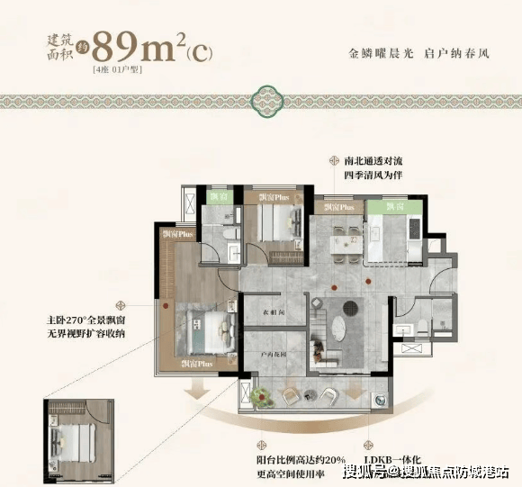 这是项目的刚需主力户型,分为竖厅动静分区和南北对流两个版本。四开间朝南的设计,让阳光洒满房间的每一个角落。双面宽阳台,不仅拓展了观景视野,更增加了室内的采光和通风。主卧配备270°转角飘窗,全飘窗可打通拓展,空间灵活度拉满。在这个面积段,能做到如此舒适实用的三房设计,实属难得。无论是新婚夫妇,还是三口之家,都能在这里找到属于自己的幸福空间。