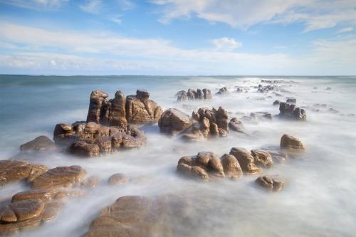 站在灯架岭上,早上可以看日出,目睹红日冲破黑暗,从东方海中喷薄而出的壮观情景。傍晚可以观日落,眼望碧海映红霞,海天为一体,美不胜收的夕景。有诗曰:海上赤壁听惊涛,怪石如画浪如刀。疑是诸葛八卦阵,东坡犹赞古今豪。贴士: 饮食:怪石滩岸边有众多的海鲜酒家,还有附近渔民新鲜捕捞上岸的新鲜河蟹。您尽可在饱览美景和留下倩影后,一边看日落潮退,一边满足口腹之欲。 住宿:怪石滩附近没有宾馆住宿,游客可到港口区或防城区寻找住宿。 交通: 【自驾路线】从港口区过跨海大桥后,往东兴方向走,两公里左右有指示牌左拐进去约26公里即可到达,途中路过白浪滩景区(强烈推荐)。 【旅游专线】可从港口和防城搭乘前往白龙的中巴车前往怪石滩。海滩的中段风平浪静、温宛可人,两边的海滩却是怪石嶙峋。特别东段的“海上赤壁”,以奇特的海蚀地貌而著称。千奇百怪的石头连成一片,沿着海岸延伸,像一道的坚固屏障。千百年来潮涨潮落中所创造的海蚀地貌,崖高岩矗,奇险万分。第三站:白浪滩来到白浪滩的时候已经是傍晚,游客已经不多,但火红的晚霞映在海面上,别有一番风味。白浪滩位于防城港港口区附近的江山半岛,离港口区的汽车总站不过10来公里,过了往东兴的过海大桥就可以看到路牌指示了,沿着海边的公路一路开就能到景区。