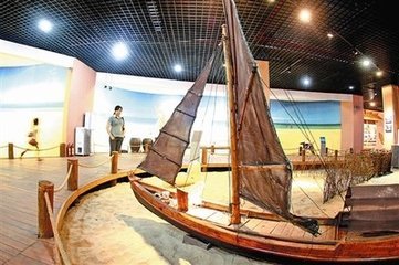 金滩面积15平方公里,因沙色金黄而得此名。金滩之沙金黄、细腻而柔软,纯天然的沙滩延绵数十里,站在金滩上,迎着海风、隔着蔚蓝色的海水,可以遥望西南方向水天一色的越南海景。 每当潮水退下,湿漉漉的十里沙滩上,潮纹隐现、珠玑遍地,各种各样的海滩动物纷纷“崭露头角”,大大小小的螃蟹横行无忌。常常能见到头戴金色葵叶帽、身穿彩衣的京族妇女身影。第二站:京族博物馆 下了大网之后,趁着鱼进网的时间,我们游览了离金滩不远的京族博物馆。东兴京族博物馆是一座以收藏、保护、研究、征集、展示京族物资与非物资文化遗产的专题性民族博物馆。馆内常设基本陈列《大海是故乡——广西东兴京族文化展》展览运用翔实的资料、艺术的构思和科技的手段,通过实物、场景、图片、音像来展现京族古朴而浓郁的文化。