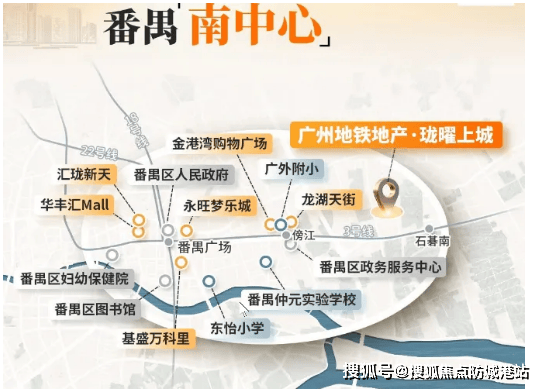 周边现有商业:项目西侧紧邻金龙城财富广场,该广场内有不少底商,且已引进麦当劳等知名餐饮品牌,步行仅需5-8分钟即可到达,日常买菜、购物、用餐十分便捷;距离项目2站地铁(约10分钟车程)的番禺广场,作为番禺区府所在地,集合了番禺的行政、交通、教育、医疗、文化中心,是与北万博平齐的番禺南中心,也是番禺居住配套最齐全的区域之一。