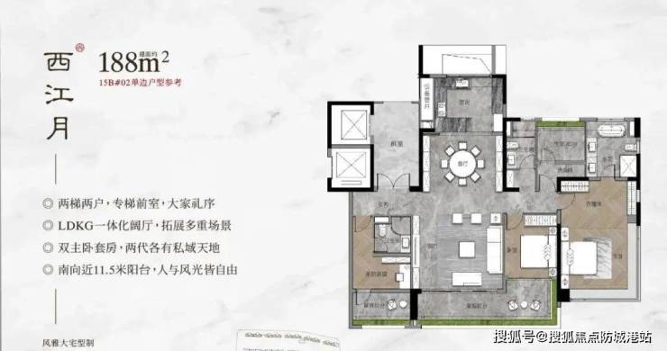 4. 建面约268㎡五房两厅四卫(3T2板楼):该户型为项目旗舰户型,传世稀缺藏品,梯户比为3T2,配备保姆电梯,实现业主与保姆分流,私密性与尊崇感拉满,得房率高,空间尺度极致,南北对流设计,通风采光效果极佳,可全方位欣赏社区园林景观与山顶公园美景,适配顶级改善人群、家族式居住或高端商务接待需求。该户型目前即将加推,仅25个席位,稀缺性极高,错过再无。户型空间宽敞大气,布局灵活,可根据需求规划私人会客厅、宴会厅、书房、卧室、健身区、休闲区等多个功能空间,兼顾居住、社交、商务等多元需求;户型整体采光面阔绰,坐拥项目中至为宽敞的前后楼间距,让室外的景观、采光都能充分融入室内;采用双主套设计,互不干扰,大家庭的业主既能保证一家人(如父母长辈)有足够的生活空间,又能拥有自己的私密空间,若家庭成员不多,另一套主套还可DIY成书房、电影院、茶室等,增添生活乐趣;LDKG近120平的大方厅设计,包含厨房、餐厅、客厅和阳台,南北对流,夏天不开空调也能感受到风的凉爽,空间利用率极高,无论是大家庭聚会还是孩子玩耍,都绰绰有余,家长也方便照看孩子;主卧配备步入式双衣帽间、双台盆卫生间与270°全景飘窗,飘窗尺度超过9米,全采光设计,让阳光充分照射到主卧内,彰显家族品味与身份象征;全屋配备国际一线装修标准,甄选高端品牌家电、卫浴、建材,细节之处尽显极致尊崇,融入新中式文化元素,贴合顶级改善人群的居住品味;适合追求极致居住品质、注重身份象征与家族传承的顶级改善人群。