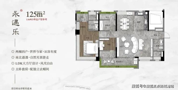 2. 建面约125㎡四房两厅两卫(2T4塔楼):该户型为改善主力户型,梯户比为2T4,得房率高,空间利用率优异,户型布局灵活,户户朝南,通风采光效果极佳,适配改善人群、三口之家或小型三代同堂家庭居住。需要重点说明的是,该户型右上角空白处实际交付也是一个房间,可作为书房、儿童房或休闲区,进一步提升空间利用率,满足业主多元居住需求。该户型注重通风采光与空间尺度,客厅与南向大阳台一体化设计,阳台视野开阔,可欣赏社区园林景观,提升居住舒适度;主卧配备独立卫生间、观景飘窗,空间宽敞舒适,彰显居住尊崇感,次卧空间充足,可满足家人的居住需求;厨房采用科学布局,操作空间充足,搭配餐厅,方便日常烹饪与会客,贴合改善家庭的居住需求;全屋收纳空间充足,配置玄关柜、阳台储物柜、衣帽间等,可满足改善家庭的储物需求;装修标准与大户型保持一致,配备一线品牌家电、高端卫浴与智能化配置,提升居住舒适度与品质感,适合追求居住品质、注重空间实用性的改善人群。