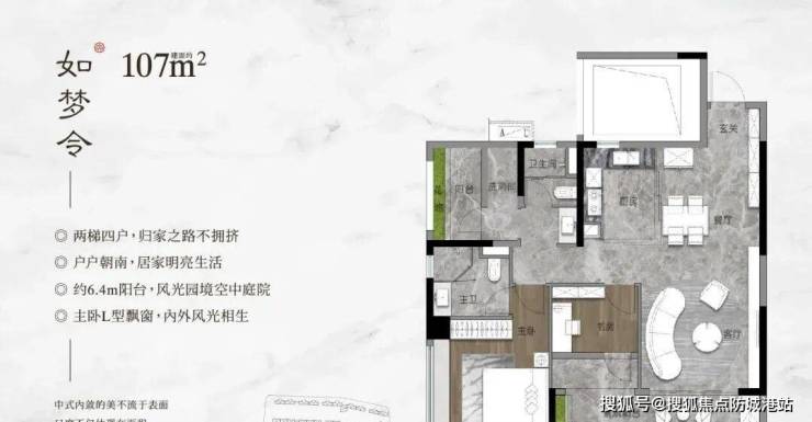 1. 建面约107㎡三房两厅两卫(2T4塔楼):该户型为入门级改善优选户型,梯户比为2T4,得房率高,空间利用率优异,户型布局紧凑合理,户户朝南,通风采光效果好,适配刚需改善人群、三口之家居住。该户型采用三房两厅两卫设计,空间布局科学,兼顾实用性与舒适度;客厅与南向阳台一体化设计,阳台宽敞明亮,可延伸空间感,同时享受自然采光与园林景观,提升居住体验;主卧配备独立卫生间、观景飘窗,增加空间利用率的同时,提升居住舒适度与私密性,次卧空间宽敞,可作为儿童房或客房,布局合理;厨房采用U型设计,操作空间充足,方便日常烹饪,贴合刚需改善家庭的居住需求;全屋收纳空间充足,配置玄关柜、阳台储物柜等,可满足业主的储物需求,提升空间利用率;装修品质高端,配备一线品牌家电与高端装修材质,细节之处尽显尊崇,适配追求高品质居住、注重性价比的刚需改善人群。