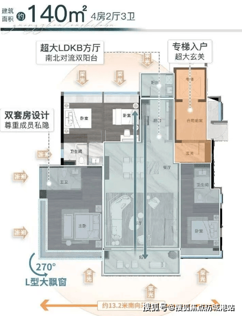 主力户型集中在140㎡、190㎡和250㎡三个面积段,全部为板式结构,两梯两户设计。这种布局在市中心已不多见,电梯位于核心筒中央,业主出梯后分左右入户,互不干扰,实际体验接近“一梯一户”。以建面约140㎡的【林隐】户型为例,采用LDKG一体化格局,公区开敞达54平方米,三面采光,南北双阳台;而190㎡的【山趣】则拥有约17米南向面宽,主卧配备270°飘窗,窗地比高达38%,远超广州普通住宅标准。更难得的是,项目按新规报建,得房率接近100%,套内实用面积明显优于同区域竞品。