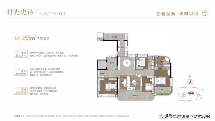253平米户型:四房两厅两卫,南北对流,阳台长达10米,主卧飘窗和主卫270度弧形采光面。