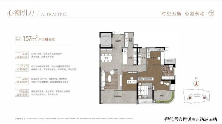 157平米户型:四房两厅两卫竖厅设计,动静分区,主卧设有270度弧形飘窗。