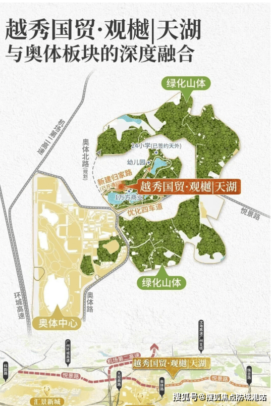 商业规划上,观樾以新加坡圣淘沙滨湖商业体为对标,沿湖打造约1万平的商业体,规划有精品超市、多元餐饮、生活配套及儿童教培等业态,三期楼下便是二期打造的该商业体,满足业主日常消费需求。约2000平美学湖岸会所已前置兑现,内部配备约25米的四泳道恒温泳池、选用意大利泰诺健器材的健身房、瑜伽室、SPA室等高奢设施。项目还与火石健身、万豪云珠酒店、方盒、玫瑰园达成战略合作,打造圈层活动平台。三公里范围内有优托邦大型商场、天河城百货、万科广场、时代E - PARK等,生活气息浓厚。医疗方面,项目社区完善医疗服务,2公里内享三甲综合智慧型医院中山六院,附近有广州复大肿瘤医院及暨南大学附属第一医院,还有规划中的6.9万㎡国际妇女儿童医院。此外,出门便是约243万方山湖林海,环绕14.9万方公园绿地、5.3万方日月双湖与1.9公里湖岸线,三面环山,水系丰富,为业主营造了舒适宜人的居住环境。