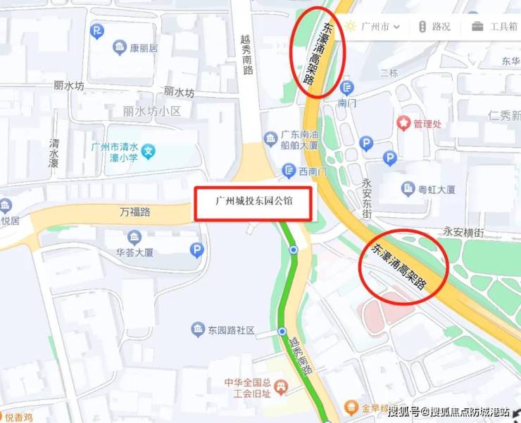 另外,老城区的楼盘身处闹市,车水马龙,居住环境一般比较嘈杂喧嚣。东园公馆位于万福路与越秀南路交界处,东濠涌高架路位于项目的东侧,多少会受到噪音影响。