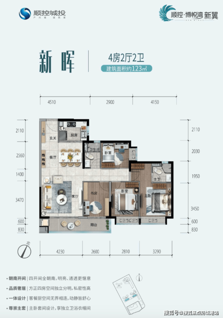 顺控博悦湾新翼户型以改善型和优教家庭需求为核心,主力面积段为一百二十三平方米与一百三十八平方米。户型设计采用点式布局,保证采光和通风效果,南向朝向充分利用日照和景观资源。动线设计科学合理,公共空间与私密空间分区明确,客厅与阳台连通,餐厨与生活区布局开放互动。大面积户型适合三代同堂生活,兼顾娱乐、办公及休闲功能,为家庭提供舒适、高效和多功能的居住体验,满足不同生活场景需求。