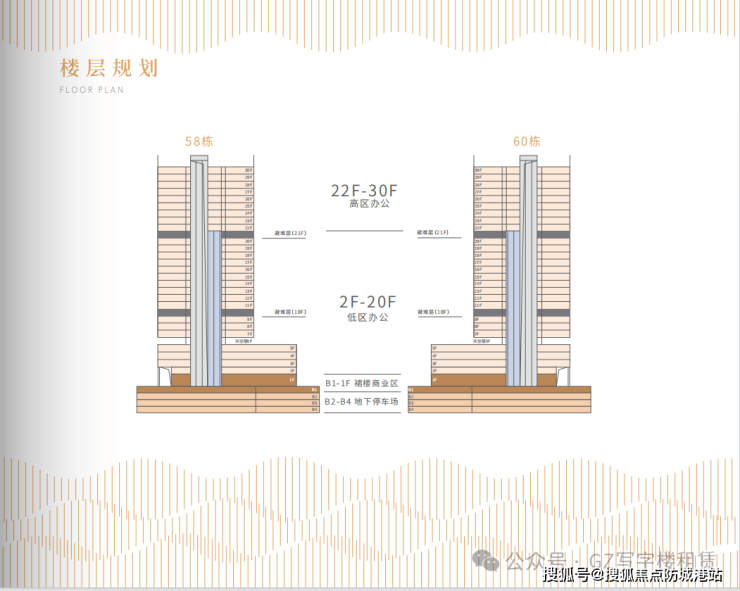 项目楼层规划科学合理,功能分区清晰,全面适配企业办公需求。地下 B4-B2 层为车库,提供充足停车位;B1-1 层为商业配套,满足企业日常消费需求;2-26 层为办公写字楼,标准层面积约 2300-2500 平方米,户型方正,可灵活分割。楼层采用核心筒布局,电梯厅、楼梯间、设备间等核心区域集中设置,办公空间环绕核心筒布局,确保每一间办公室都能拥有良好的采光、通风与景观视野。项目部分楼层规划为复式空间,挑高设计打造双层办公空间,空间感极强,可满足企业高端办公、私人会所、企业展厅等多元需求,为企业提供个性化的办公选择。
