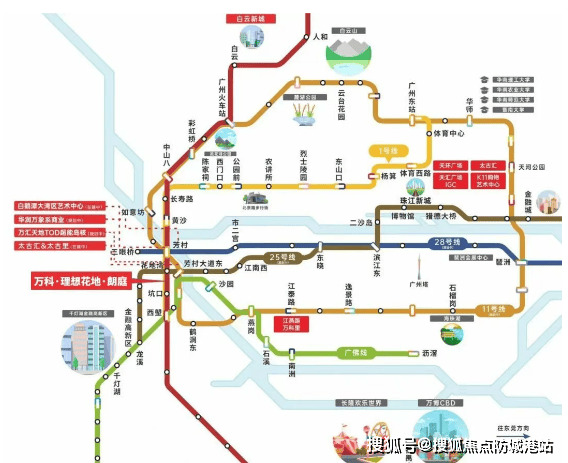更值得期待的是广州地铁22号线后通段(在建):未来从芳村站出发,南下可直达广州南站、南沙,北上经白云火车站抵白云机场,形成南北大动脉。同时,1号线在芳村站可换乘11号线(广州大环线)——这条“换乘之王”全线32站中有26个换乘点,未来将进一步放大项目轨交价值。