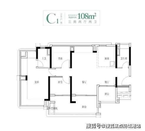 108㎡四房两厅两卫:四开间朝南,6米大阳台+主卧三面采光,可灵活改造为四房;